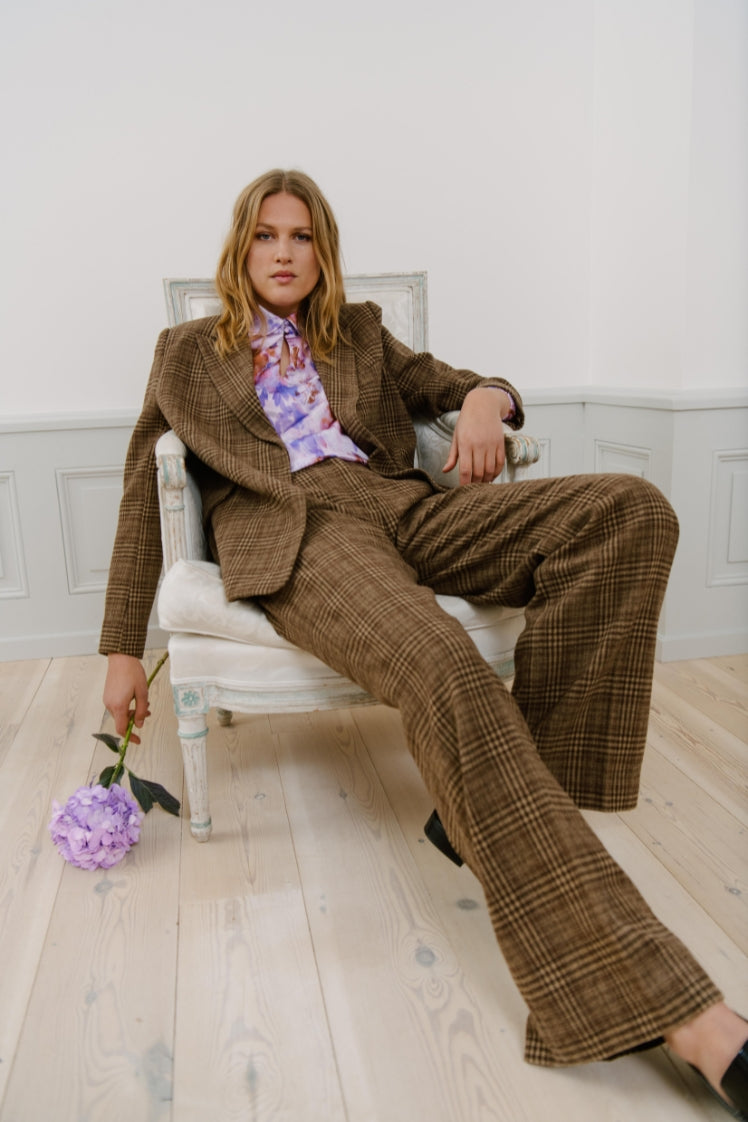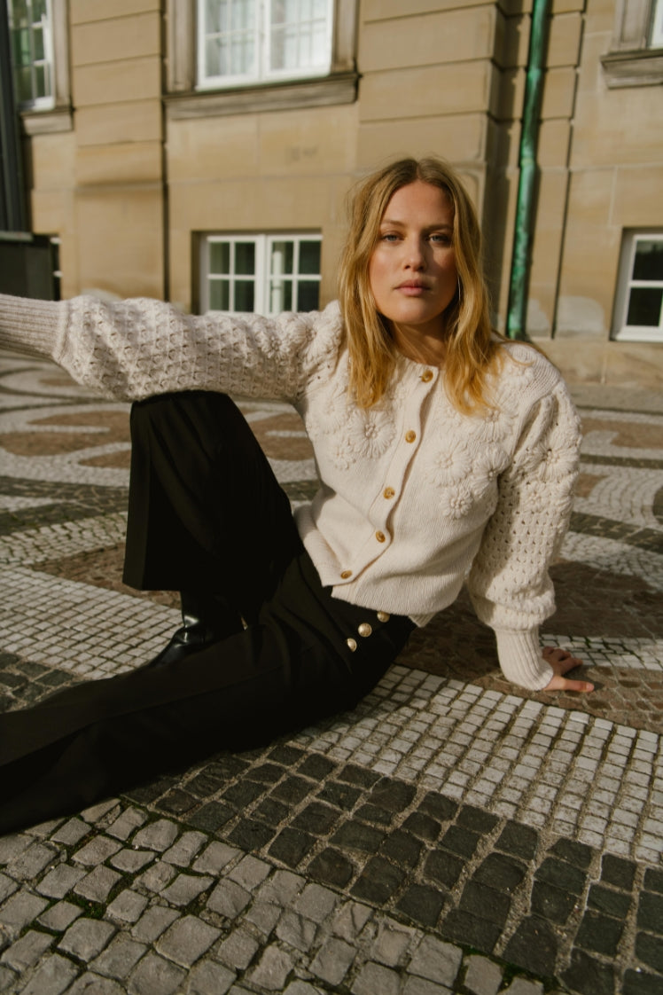 Gennem hele kollektionen er spillet mellem maskulint og feminint centralt. En hvid poplinbluse, der minder om en kunstners skjorte, har høj krave og voluminøse ærmer og fungerer smukt med drengede løstsiddende bukser i Saville Row-tern eller plisserede bukser i blødt læder. Feminine detaljer som små betrukne knapper, flæsemanchetter og faggotkanter giver en yndefuld kontrast til slouchy tweedblazere og uforede Prince of Wales-ternede frakker med bælte. Denim mister sit arbejdsbeklædningsimage og bliver elegant og chik i en fyldig nederdel eller en bandstand jakke - guldknapper er en vittig reference til jeansnitter. Strikvarer leger også med kontrasten mellem kunstnerisk og feminin med kreative frynser, der springer ud fra skuldrene på en rullekravesweater, eller håndbroderede blomster, der følger kraven på en cardigan, der står ved siden af en ærbar kort jakke i en tekstureret strik, komplet med en corsageblomst. Trods alt bør en kvindes garderobe afspejle alle aspekter af hendes personlighed...