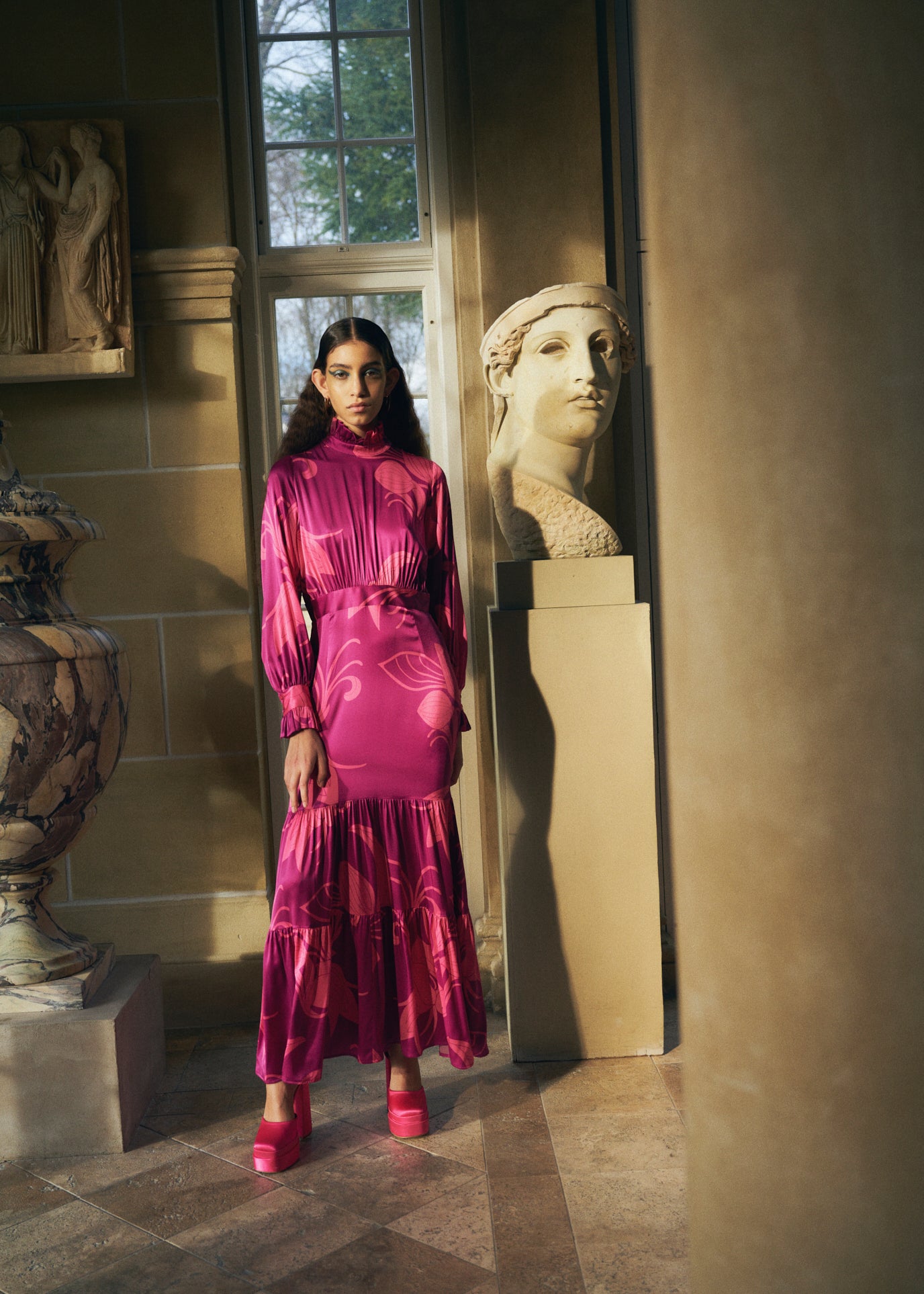 Mønstre spiller som altid en central rolle, med vinterhaveblomster der strømmer ned ad en mørk baggrund på en fuldlængde kjole eller et grafisk Art Deco-design, der skaber drama i en off-the-shoulder buksedragt med brede ben. Andre steder er store orkideer spredt ud over en silkekimono, og delikate pæoner er placeret på et sort silkekjole.