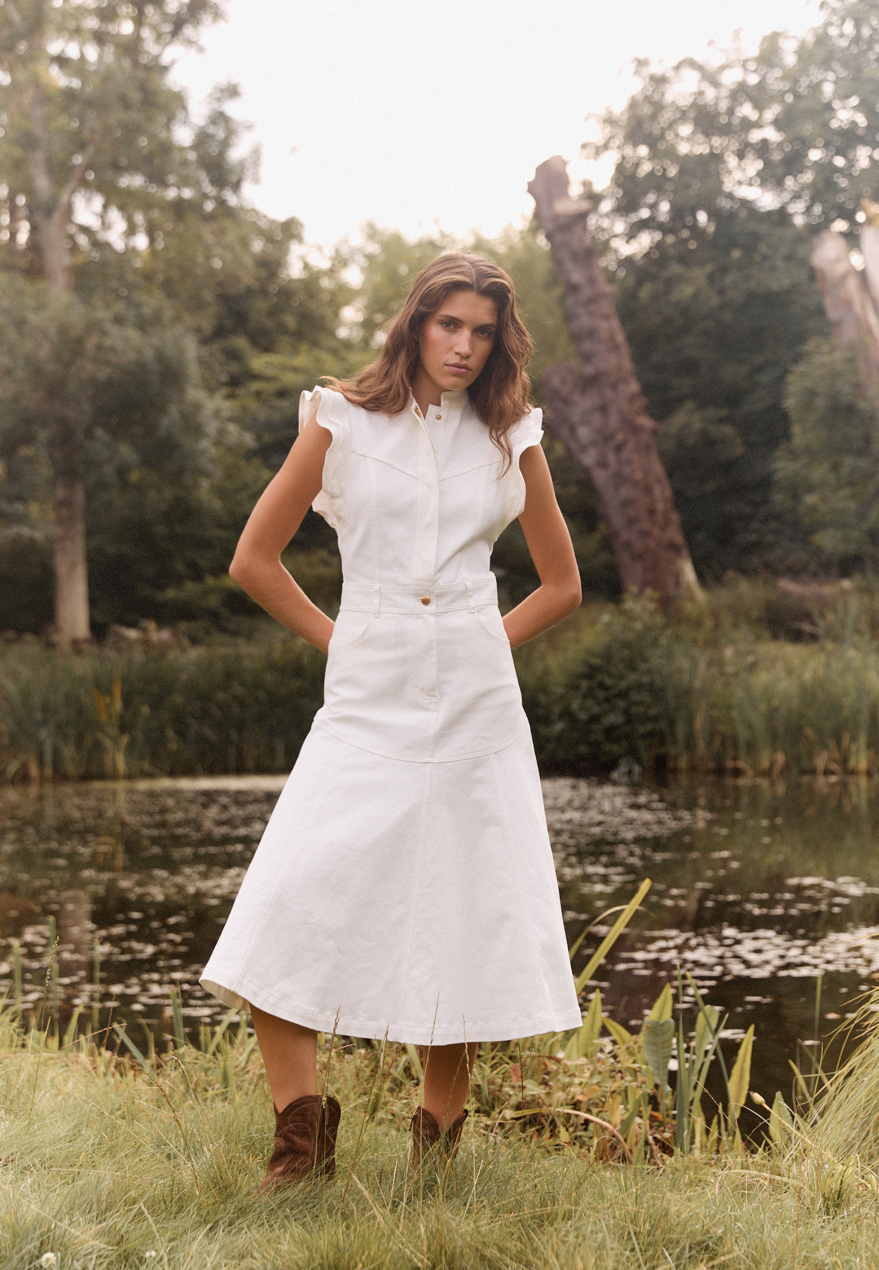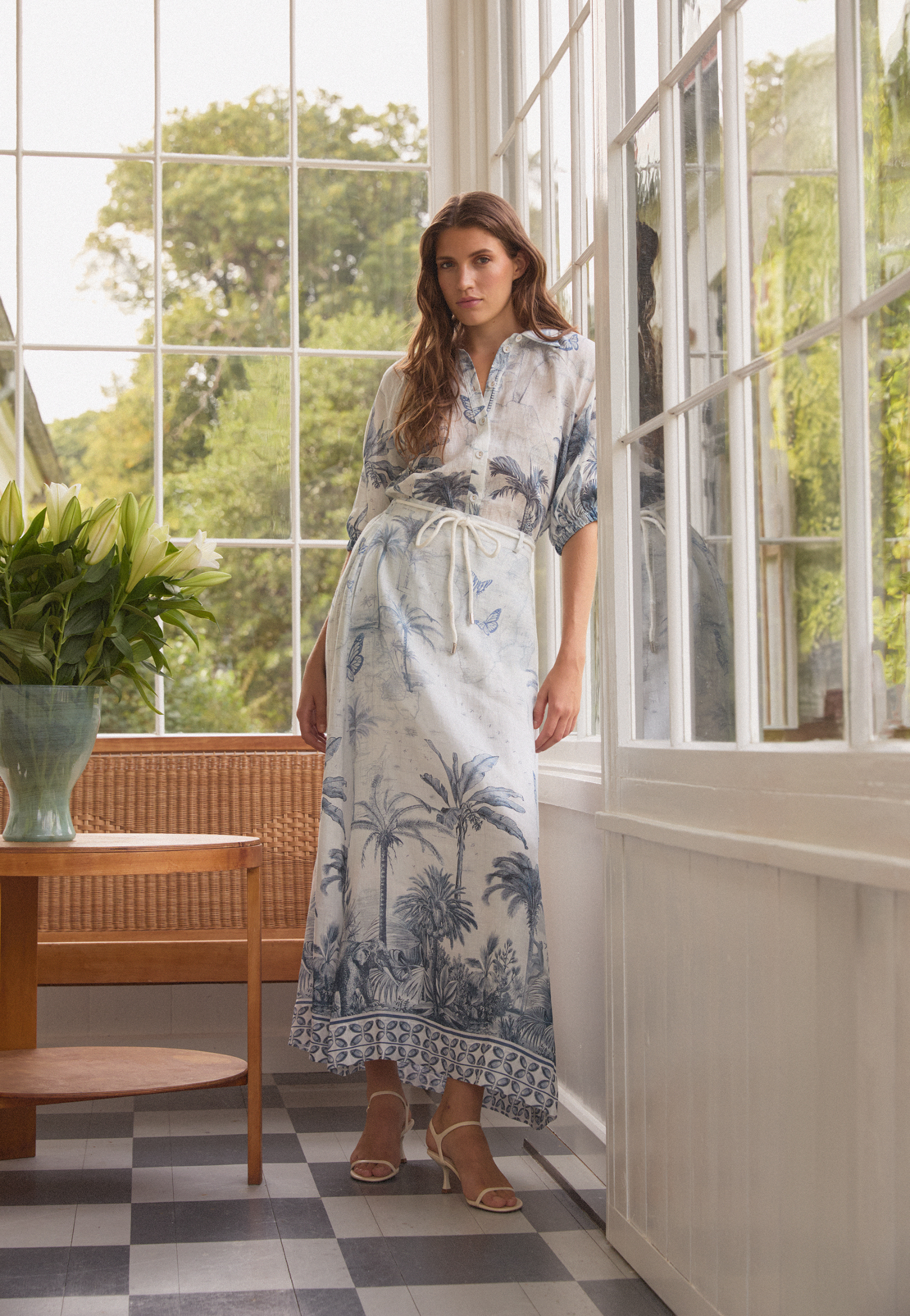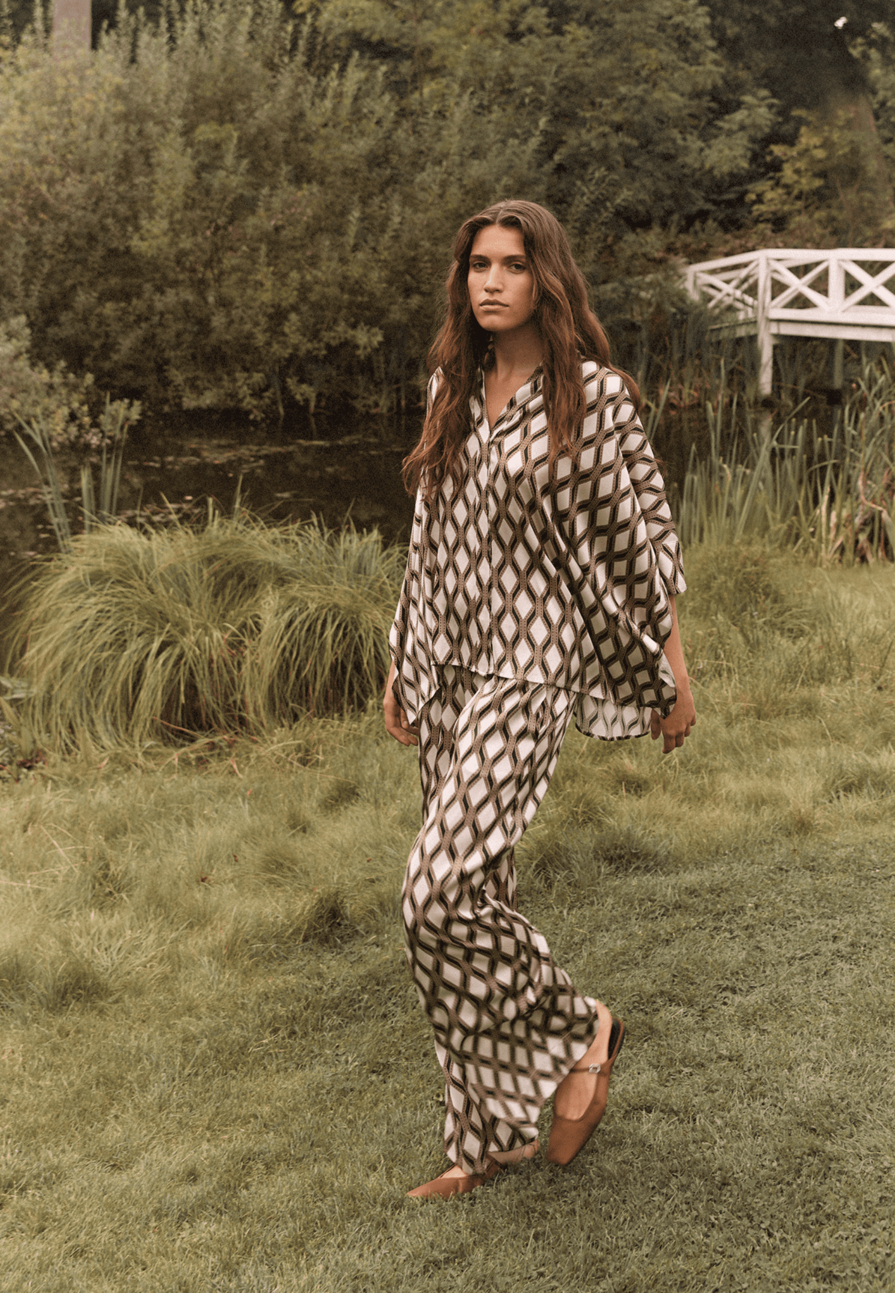 Med afsæt i den tørre farvepalette fra hendes afrikanske hjem, byder Summer 25 kollektionen på brændt rød og klar himmelblå i kontrast til naturlig sand, hvid og sort. Dea Kudibals signaturprints forener den kunstneriske charme fra et håndmalet blomstertræ, et modigt ikat inspireret design og et delikat placeret print med kort og dyreliv, mens mere grafiske mønstre henter inspiration i traditionelt fletværk. Stofferne er ideelle til varme dage og lune aftener: Let bomuldsvoile med udskåret blondekant i en kaftan eller lang skjorte med snorebælte er både stilfuldt og ubesværet, mens hvid denim i form af cropped bukser eller en skjortekjole med flæseærmer forener funktionalitet med femininitet. Et kompakt twill stof i savannebeige giver et retro 70’er look i en safari kjole med bindebælte eller en kortærmet skjortejakke. Aftenerne får et strejf af afslappet glamour med en let, printet georgette kjole med udskårne skuldre – eller mere dramatik i en farvestrålende top med én skulder og en stor flæse. Når temperaturen falder med solen, kan man trække i en strik med blonder, der lader et glimt af solkysset hud og nøgen kraveben skinne igennem.