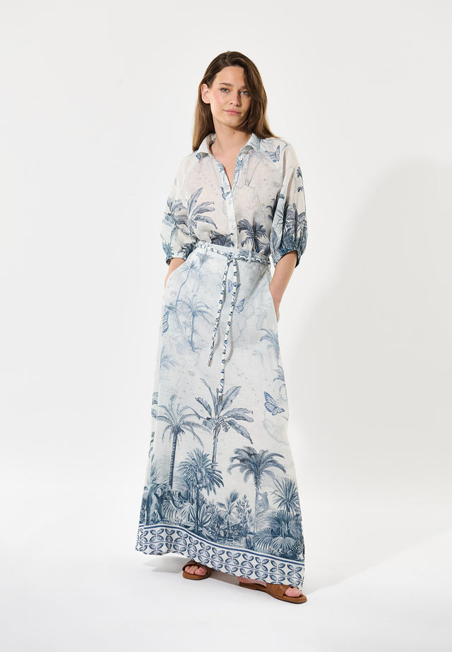Et print af antikke raderinger, der afbilder et tropisk landskab, tilføjer et strejf af sofistikering til denne fine linnedskjorte med let pasform og raglanærmer. En pæn skjortekrave og elastiske 3/4-lange ærmer gør tingene enkle.