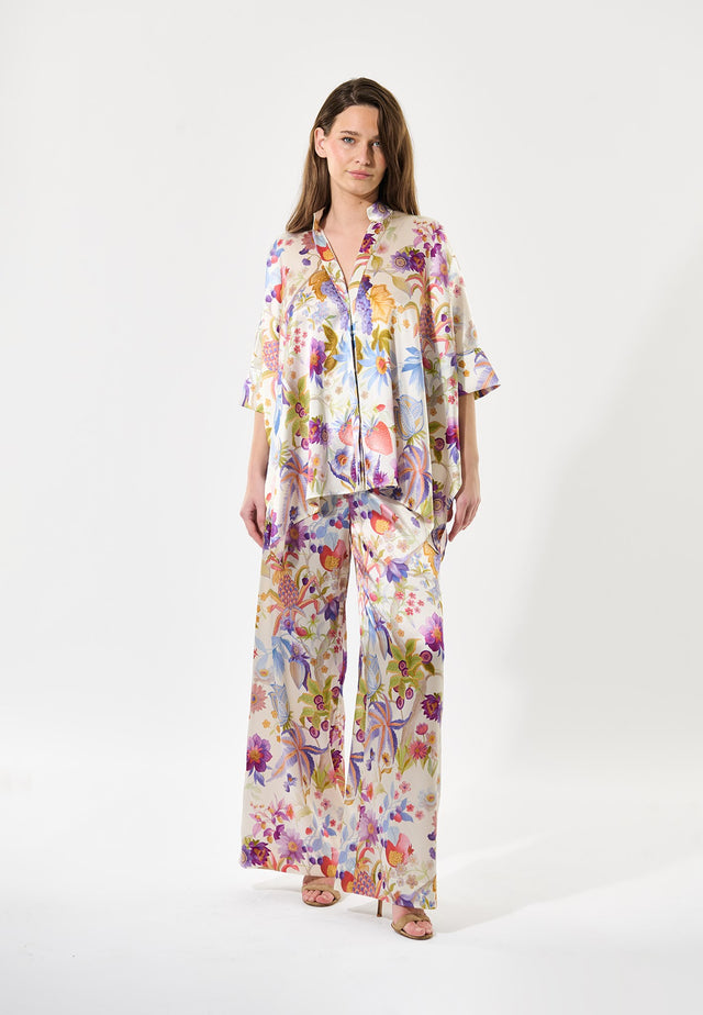 Oversized og nem at have på er denne meget brede skåret bluse i et smukt blomsterprint. Blusen er lavet i silke, har 3/4-lange ærmer, en skjult knap foran og en lille standkrave. Brug den sammen med jeans til et afslappet dagslook eller klæde det op med en nederdel til aften.