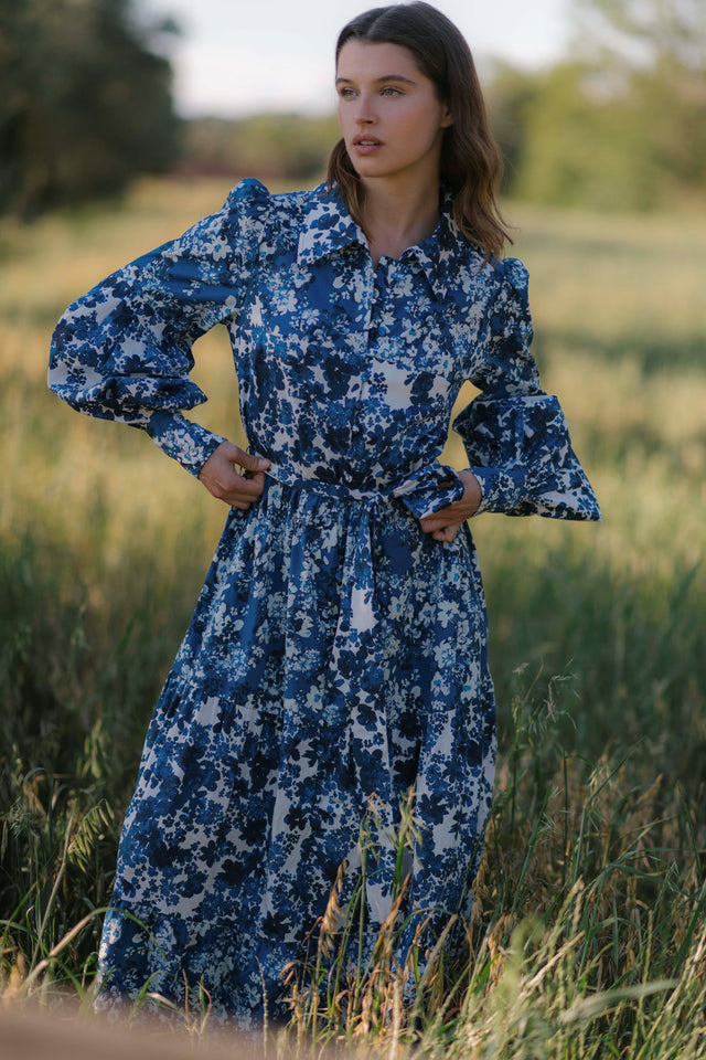 Denne elegante skjortekjole i et blåt blomsterprint er tætsiddende på kroppen, før den flares ud i en fuld maxilængde. Biskopærmer tilføjer et ekstra element til silhuetten, mens små dækkede knapper er en fængslende detalje. Et bælte i samme stof definerer taljen.