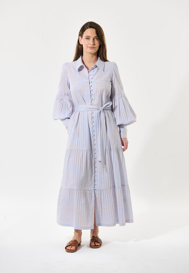 Denne meget smukke skjortekjole i en lyseblå tekstureret bomuldsstribe sidder tæt på kroppen, før den flarer ud i en hel nederdel. Biskop ærmer tilføjer elegance til silhuetten, mens små beklædte knapper er en charmerende detalje. Et bindebælte definerer taljen.