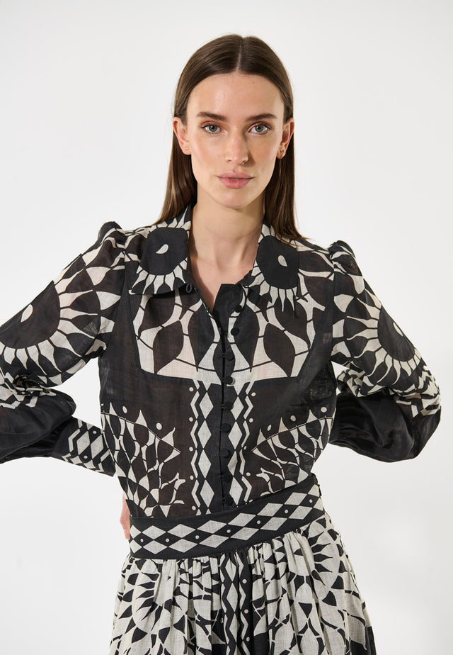 Denne bløde hørskjorte skiller sig ud med et dristigt grafisk sort-hvidt print. De fyldige ærmer giver en dramatisk silhuet, og små stofknapper med løkker tilføjer en elegant finish.