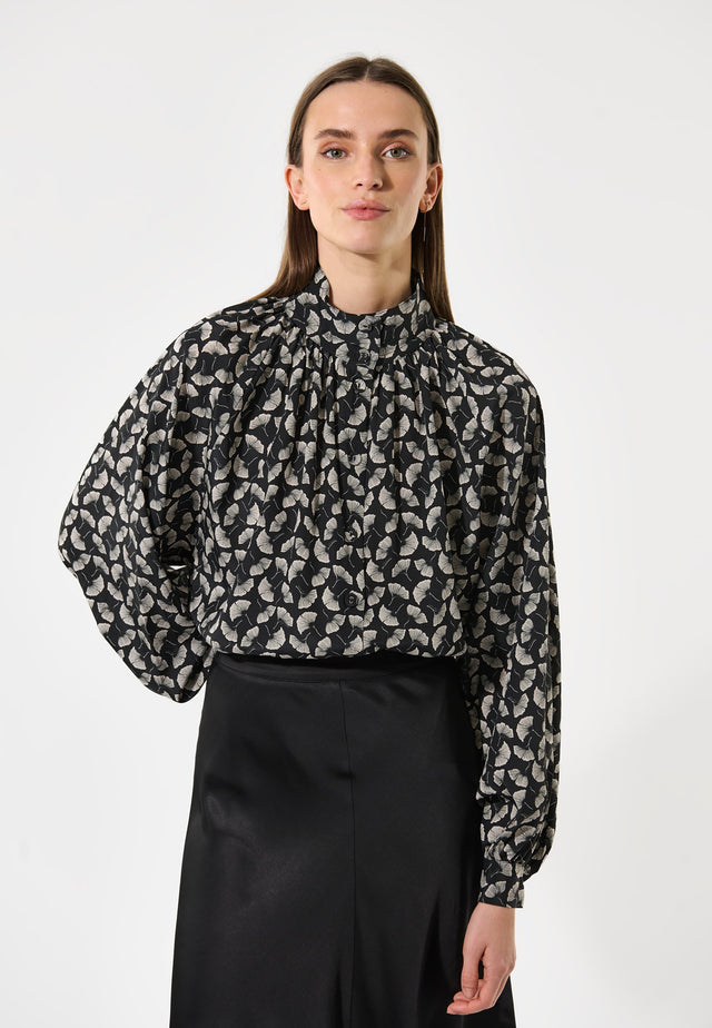 Voluminøse raglanærmer giver denne loose-fit bluse en feminin silhuet. Blusen er lavet i silkestof med et indviklet gingko-bladprint, samlet i en høj hals, og de skjulte knapper foran tilføjer et elegant touch.