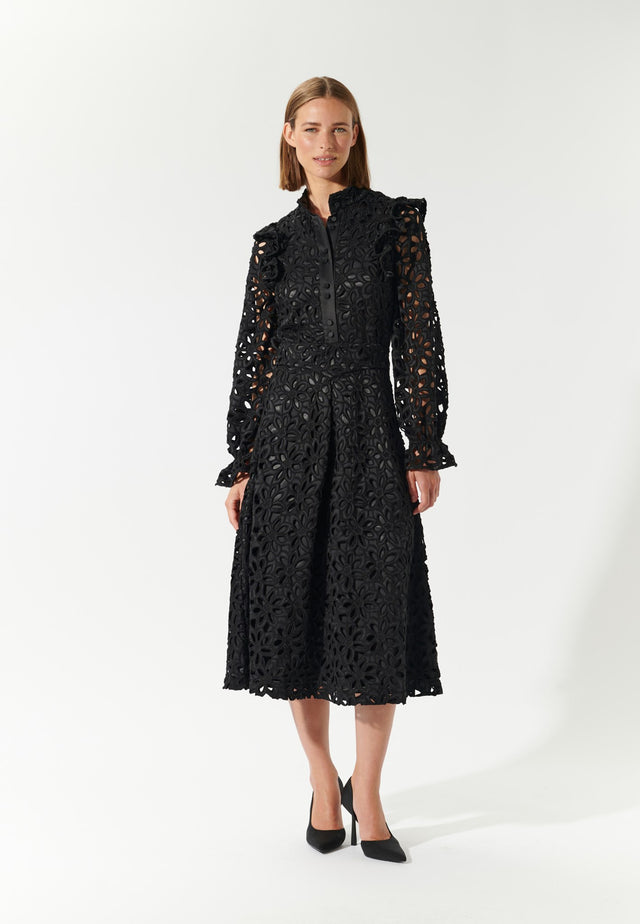En lille sort kjole er et must i enhver garderobe, men denne version er særligt romantisk. Lavet af oversized sort broderie-anglais, er den tætsiddende over brystet og taljen, før den flader ud i en midt-læg længde nederdel. Der er delikate flæser ved den opretstående krave og skuldre, og ærmerne samles i elastiske manchetter. Kjolen er fuldt foret med stretch-satin.