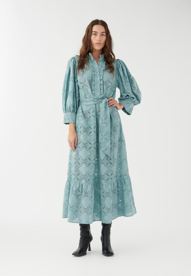 Delikat og feminin, denne printede bomuldsblandings kjole i en blød, lys blå broderie anglaise har flæser foran og ved halsen samt en dyb flæse ved sømmen. Voluminøse ærmer tilføjer til den smukke silhuet, og kjolen kan trækkes ind i taljen med et bindebælte.