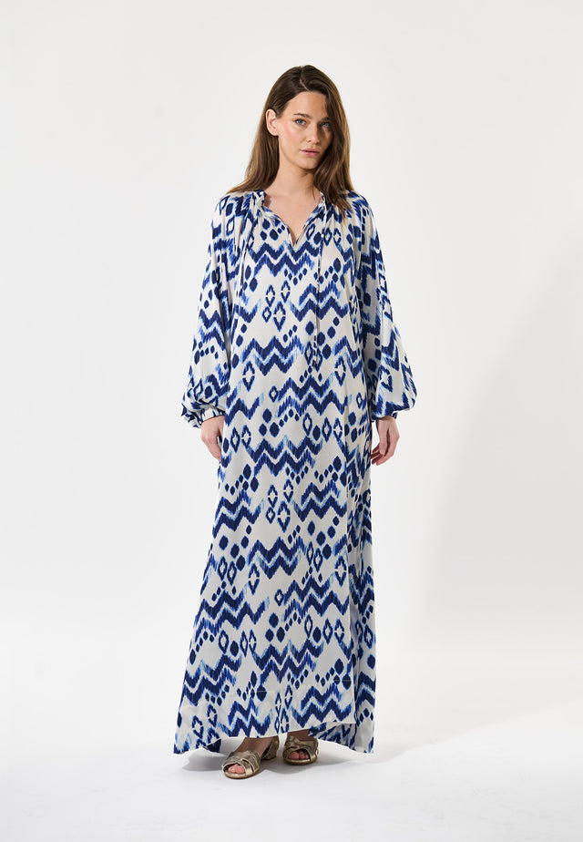Denne lange kjole er perfekt til sommeren - stilfuld, men afslappet. Med dens lette pasform og en flydende silhuet er den lavet af silke med et batik inspireret print, mens en dobbelt flæse danner en ståkrave over en v-hals med snørelukning. De voluminøse ærmer er afsluttet med elastiske manchetter, der kan skubbes op for et afslappet look.