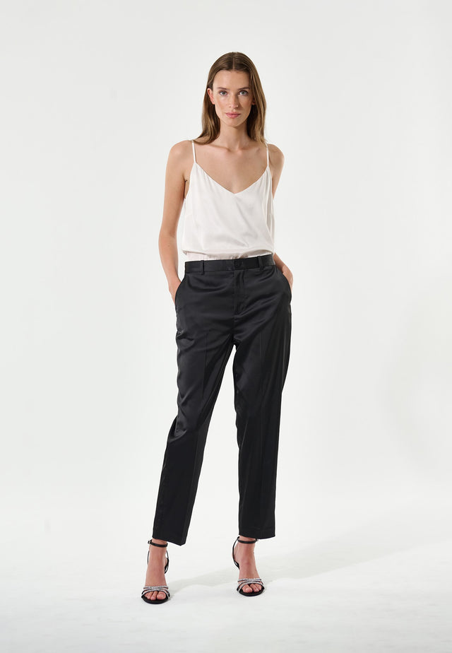 Altid en elegant klassiker til bukser er et simpelt par slim fit cigarette-bukser. Denne version i sort satin-viskoseblanding er beskåret til anklen og har side- og baglommer med en dækket knap som detalje.