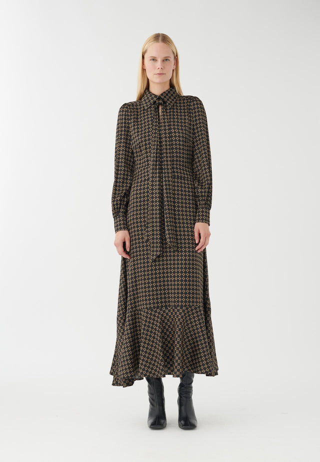 Denne kjole er tætsiddende i overdelen og i taljen, før den falder til en nederdel med dybe flæser. Den afsluttes med en pæn krave ved halsen. Det lille grafiske print i afdæmpede farver på silke gør kjolen tidløs.