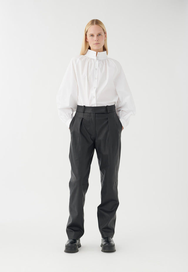 Sorte læderbukser er perfekte til vinteren, da de både er stilfulde og praktiske. Denne version i stretchlæder har en løs pasform med læg, der giver en følelse af lethed. De fungerer smukt med enten en sweater eller en skjorte.