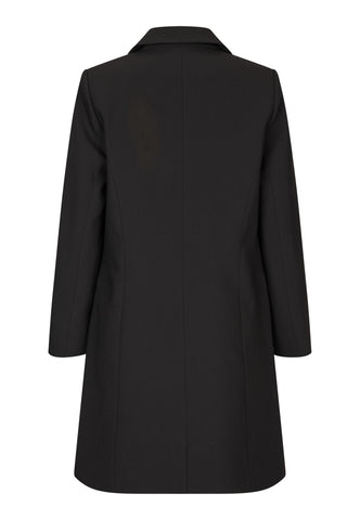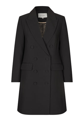 Sort blazer-kjole med dobbeltradede stofbetrukne knapper og brede, spidse revers. Tæt pasform, som fremhæver talje og figur. Dybsort crepe med subtil struktur — falder flot. Fuldt foret med monogram-print — komfort, god pasform og luksuriøst finish.