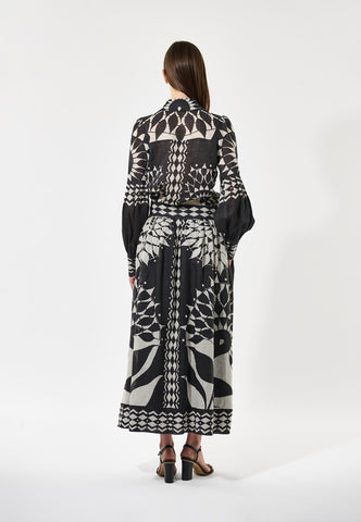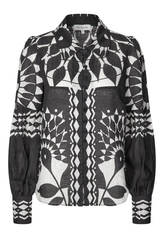 Denne bløde hørskjorte skiller sig ud med et dristigt grafisk sort-hvidt print. De fyldige ærmer giver en dramatisk silhuet, og små stofknapper med løkker tilføjer en elegant finish.