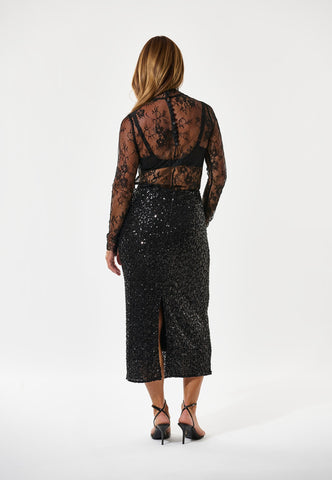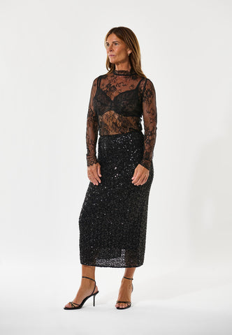 Denne højhalsede langærmede top i sort blonde er perfekt til en fest eller en særlig begivenhed og er et sofistikeret og moderne bud på aftentøj. Den sidder tæt til kroppen, har flossede kanter ved hals, manchetter og søm og ser smuk ud over en bh eller camisole-top eller lagdelt under en simpel sort blazer. Den lukkes med dækkede knapper i nakken.
