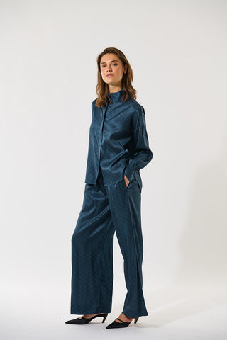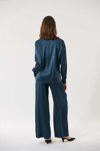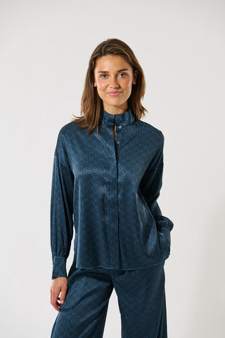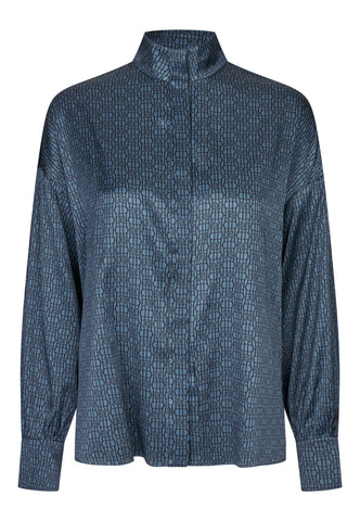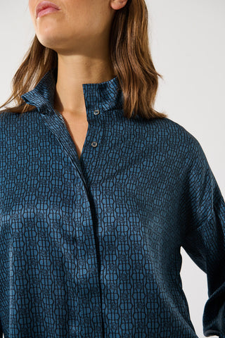 Denne silketwill-skjorte med stående krave har en gylp med skjulte knapper foran, som giver et rent og minimalistisk look. Printet med et abstrakt monogram på mørkeblå baggrund skaber et grafisk og moderne udtryk.