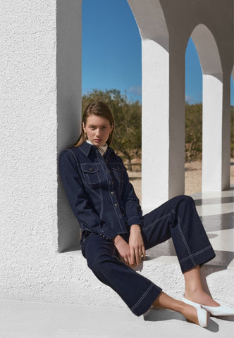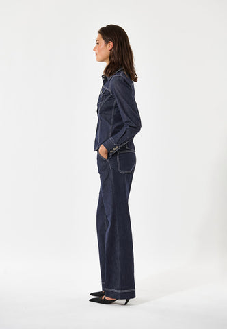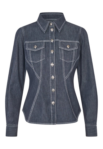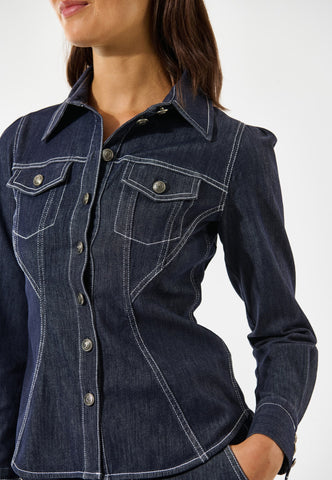 Kontrastsyninger fremhæver feminine kurver på denne smukke, tætsiddende denimskjorte. Dobbeltsyninger, klaplommer og logoknapper i metal giver skjorten et moderne twist på den klassiske westernstil.