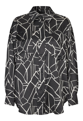 Afslappet, men stadig sofistikeret, denne silkeskjorte med et abstrakt, oversized monokromt print kan styles både til hverdag og til fest. Klaplommer på brystet og små skjulte knapper giver et elegant finish.