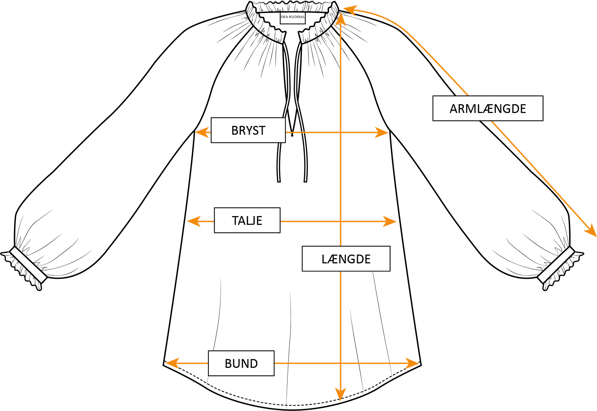 Illustrationen viser hvad denne style måler liggende fladt. For at finde den rigtige størrelse til dig, kan du evt. sammenligne disse mål med en lignende style i din garderobe som passer dig godt. Der kan være små udsving i målene på grund af produktionsprocessen.