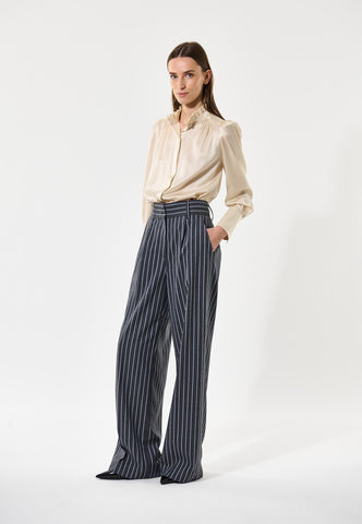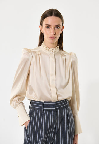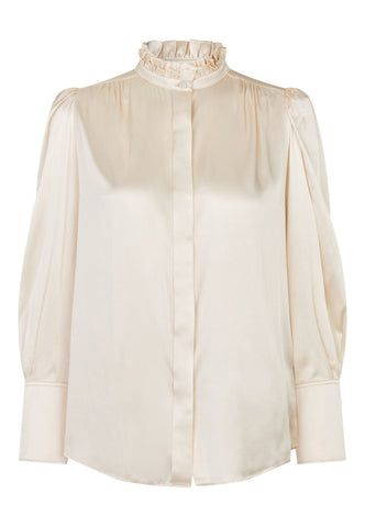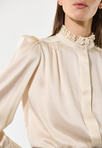 Denne sofistikerede og elegante bluse har en stilfuld standkrave og skjulte knapper foran. Små læg foran og bagpå ved halsudskæringen giver et fint, struktureret look, og blusen er lavet i lækker cremefarvet silke-twill.