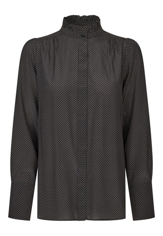 Denne elegante og stilfulde bluse har en raffineret krave og skjulte knapper foran. Små læg foran og bagpå ved halsudskæringen skaber et fint, struktureret look, og blusen er lavet i sort silke med diskrete hvide nåleprikker.