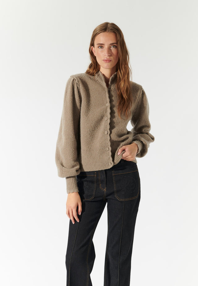 Bølgekanten langs denne lysebrune cardigan tilføjer en usædvanlig og feminin detalje, mens den høje krave og de voluminøse ærmer skaber en smuk silhuet.