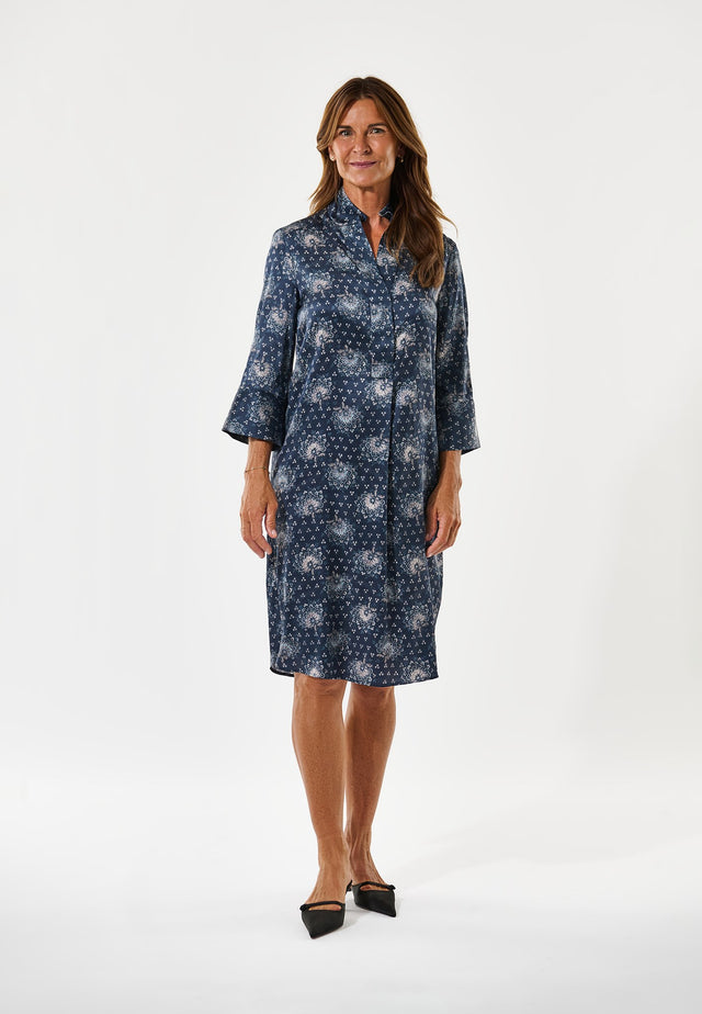 Denne midilange kjole er afslappet, men stadig stilfuld. Kimonoudskæringen og kraven giver et sofistikeret touch, mens de dybe ærmer med skjulte knapper tilføjer en afslappet elegance. Kjolen er lavet i blå silke med et delikat blomsterbukketprint.