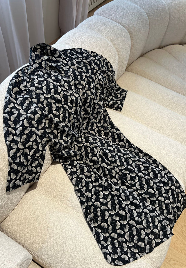 En af Dea Kudibals mest elskede stilarter, denne kjole med let pasform til midt på læggen er afslappet, men stadig sofistikeret. Kimonoudskæringen og kraven skaber et elegant udtryk, mens de dybe ærmer med skjulte knapper giver et let og afslappet look. Denne version er lavet i silke med et fint gingko-bladprint.