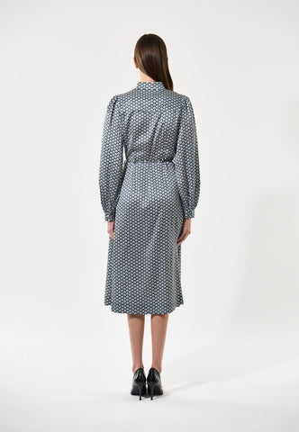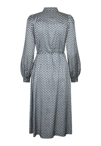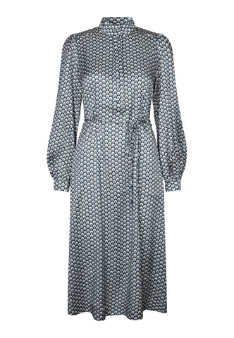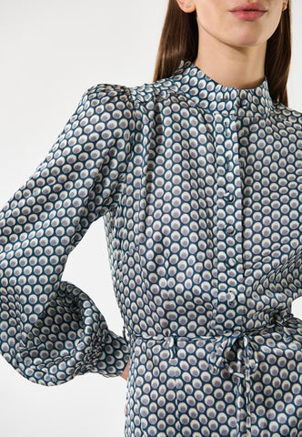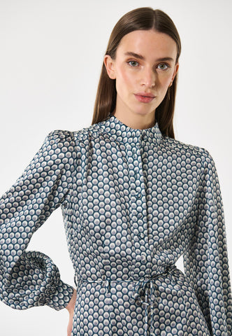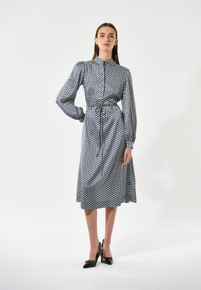 Denne kjole i silke med grafisk, optisk print sidder monteret på kroppen og blusser ud i en A-line nederdel til midt på læggen for en flatterende silhuet. Den har en standkrave, fulde ærmer med knappede manchetter og et selvstofbælte med metalender. Kjolen lukkes med en skjult lynlås i siden og en stolpe foran med skjulte knapper.