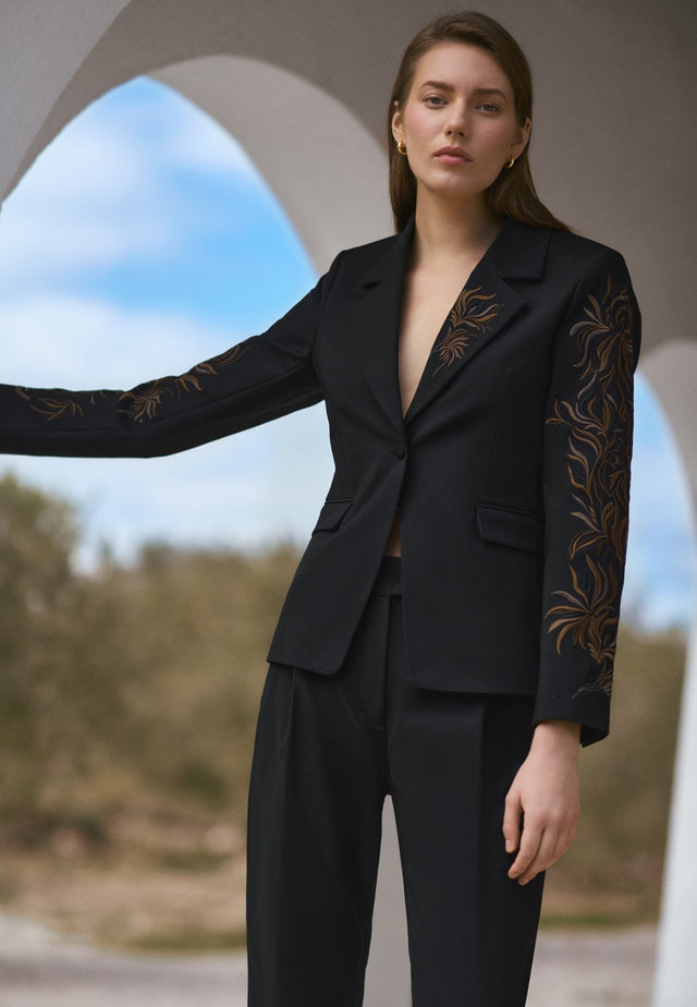 Delikate blade og kronblade broderet i nuancer af kobber og guld arbejder sig ned ad ærmerne og reverset på denne jakke og løfter den til noget helt særligt. Den luksuriøse blazer i bomuldsblanding er figursyet i taljen, har to klaplommer og lukkes med en enkelt broderet knap. Den er fuldt foret. Den kan bruges som jakkesæt med de matchende Cametti-bukser.