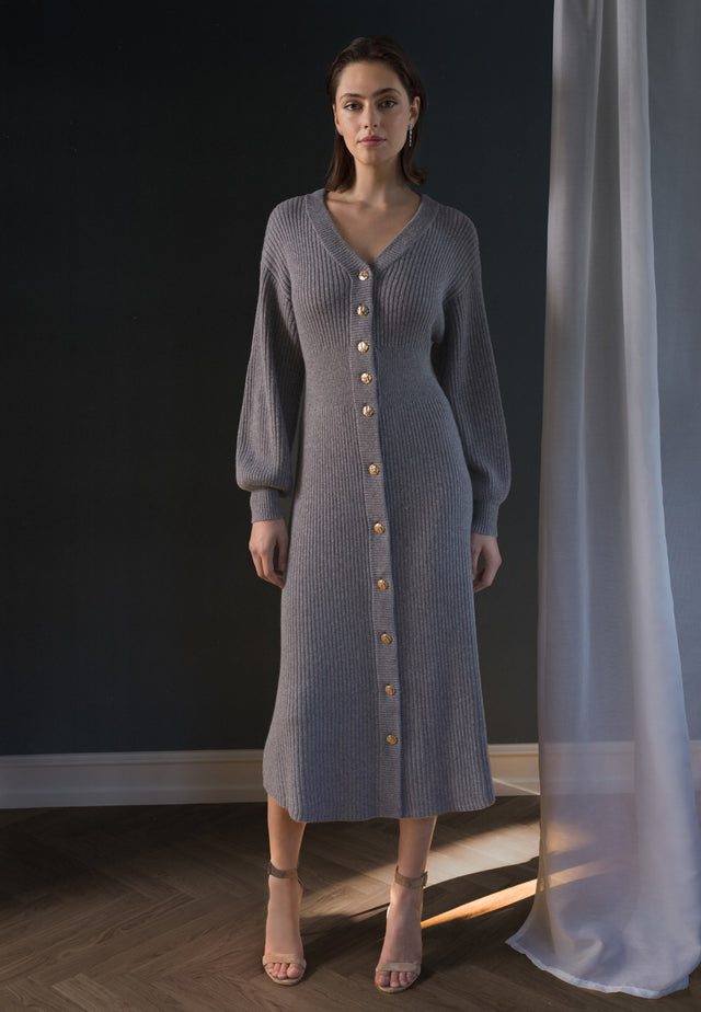 Denne luksuriøse grå strikkede kjole er lang og slank, og den sidder tæt på kroppen, før den bliver let bredere og går ned til anklerne. Kjolen er lavet af et blødt uldblandingsgarn, har en dyb V-hals, ribbede detaljer i taljen og ved ærmerne og knappes ned foran med teksturerede metalliske knapper.