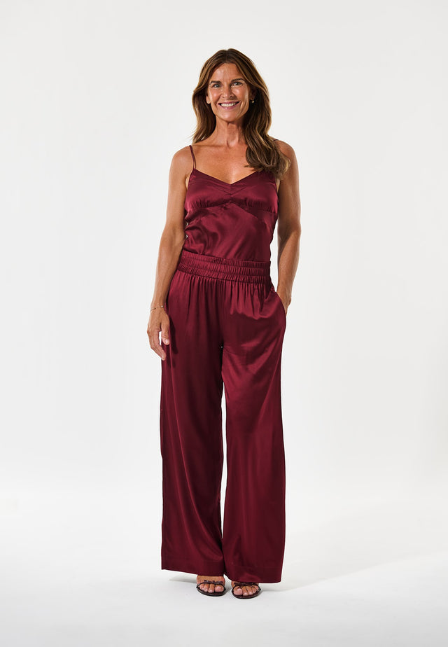 Bukser med brede ben i silke har en tidløs klassisk appel, og dette par i dyb rød med en bred elastik i taljen er et godt eksempel. Brug den med en simpel top eller en strik for et sofistikeret, men afslappet outfit.