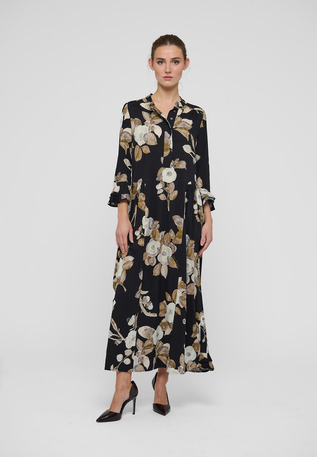 Denne mellemlange viskose-crepekjole i et smukt print af kameliaer på en mørk baggrund er feminin og nem at style, og den er løstsiddende med rund halsudskæring, stolpelukning foran og flæsemanchetter. Sidelommerne bidrager til dens afslappede følelse af lethed.
