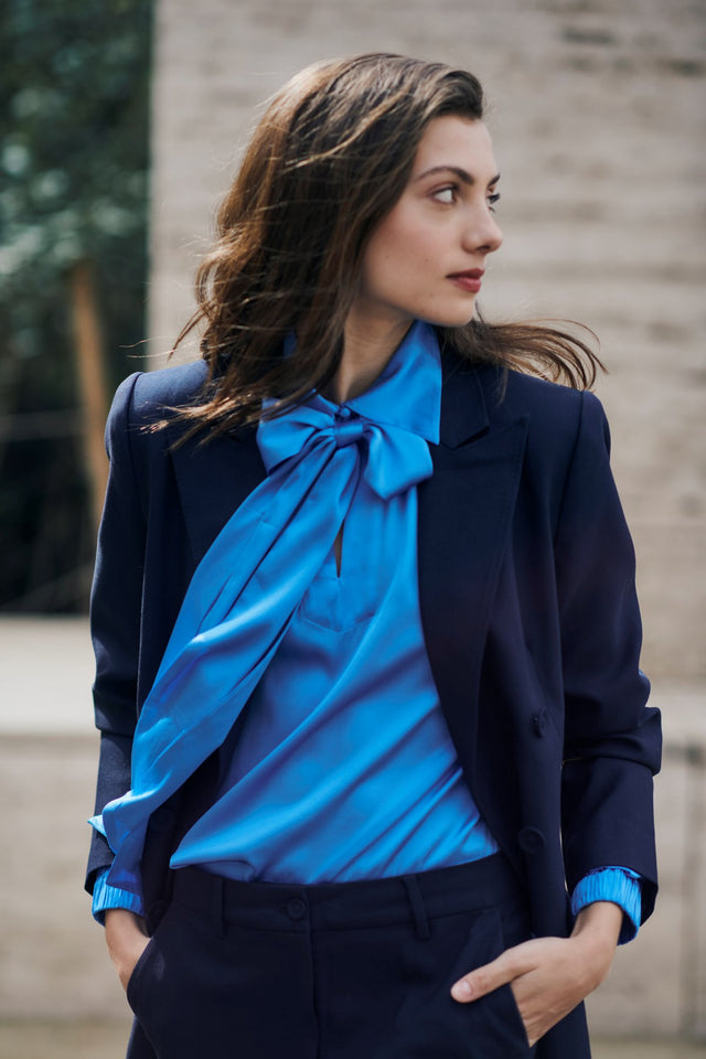 Denne smukke, stilfulde bluse i lys azurblå silketwill gør et dramatisk indtryk med den aftagelige sløjfe ved halsen. Toppen har en almindelig pasform med elastiske manchetter, der skaber en lille flæse, og der er dækkede knapper ved halsen over en nøglehulsslids foran.