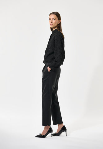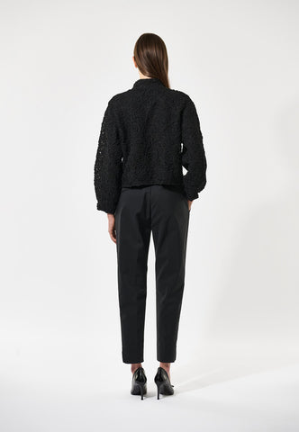 Minimale detaljer lader det udsøgte sorte blondestof stå i centrum på denne elegante jakke. Den lukkes foran med gylp og trykknapper, har en stående krave, skulpturelle ærmer og en taljebeskåret silhuet. Skab et helt særligt outfit ved at kombinere den med den matchende Alma-nederdel.