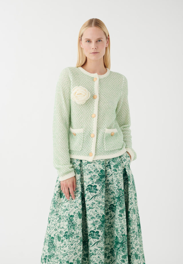 En opdateret version af en klassisk tweedjakke, denne cardigan er både elegant og tidløs. Den har en firkantet form, og det teksturerede strik i en lys grøn farve er indrammet af en cremefarvet kant, mens påsatte lommer, messingknapper og en strikket corsageblomst tilføjer de perfekte sidste detaljer.