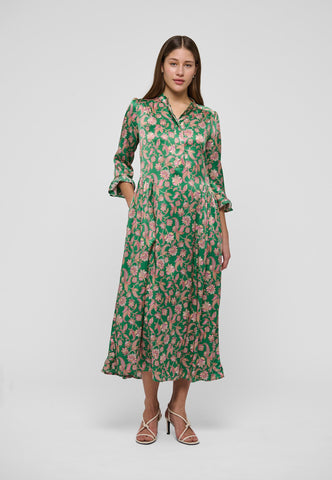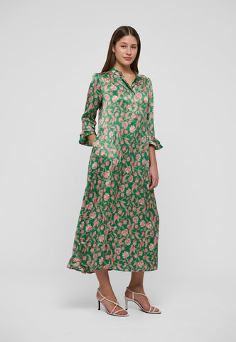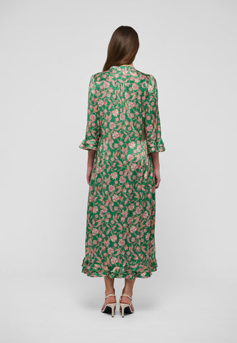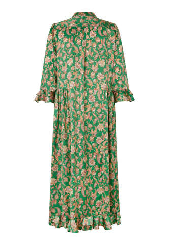Et levende paisleyprint på smaragdgrøn bund giver denne ankellange silkekjole med 3/4-ærmer masser af effekt – både iøjnefaldende og meget chic. Dobbelte flæser ved manchetter og bagkant samt rynk på ærmerne fuldender designet.