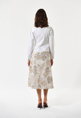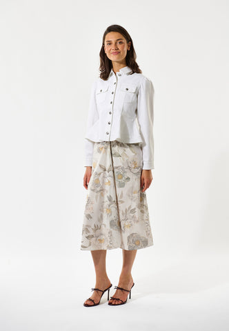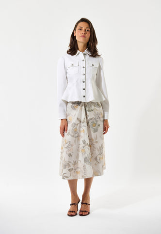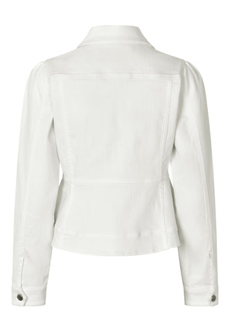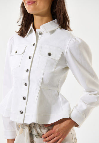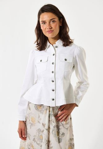 Denne hvide denimjakke kombinerer utility-detaljer med tydelig femininitet. Den har western-inspirerede lommer, klassiske jeansjakke-sømme og metalknapper, men med en figursyet talje, der derefter går ud over hofterne. Ærmerne er let rynket ved skulderen for et ekstra fint touch.