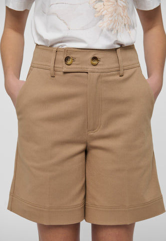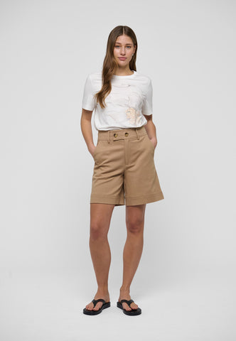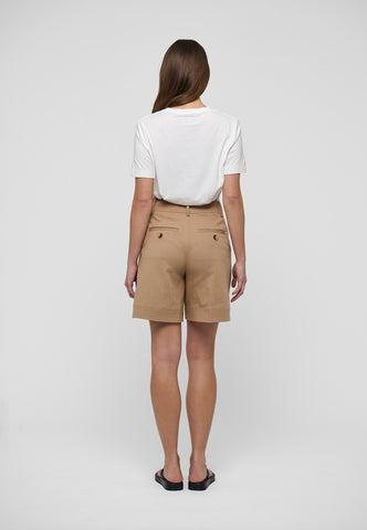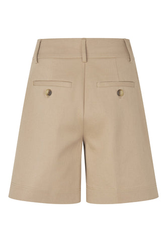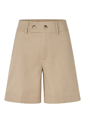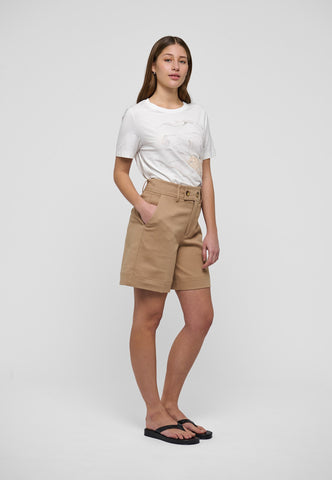 Med høj talje og vidde ben kan disse shorts i beige bomuldsdrill bruges med en enkel T-shirt om dagen eller styles med en silkebluse til aften. To sidelommer giver et afslappet udtryk.
