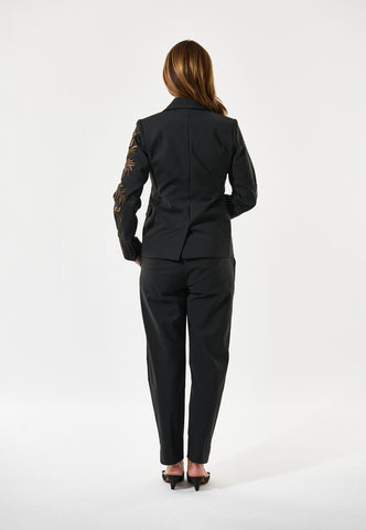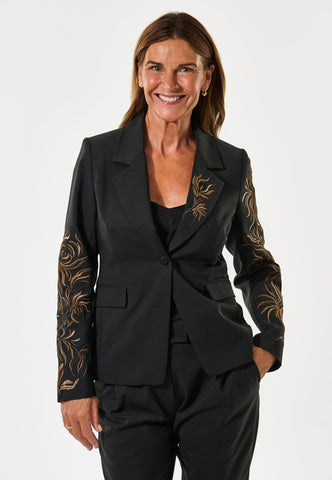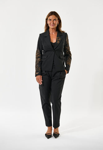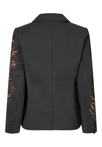 Delikate blade og kronblade broderet i nuancer af kobber og guld arbejder sig ned ad ærmerne og reverset på denne jakke og løfter den til noget helt særligt. Den luksuriøse blazer i bomuldsblanding er figursyet i taljen, har to klaplommer og lukkes med en enkelt broderet knap. Den er fuldt foret. Den kan bruges som jakkesæt med de matchende Cametti-bukser.
