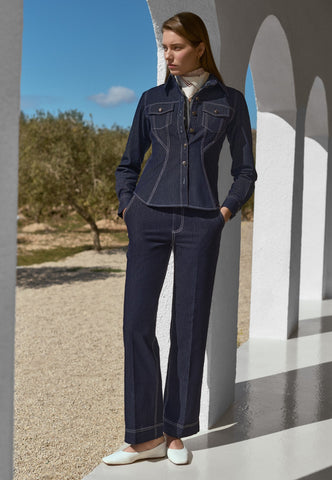 Kontrastsyninger fremhæver feminine kurver på denne smukke, tætsiddende denimskjorte. Dobbeltsyninger, klaplommer og logoknapper i metal giver skjorten et moderne twist på den klassiske westernstil.