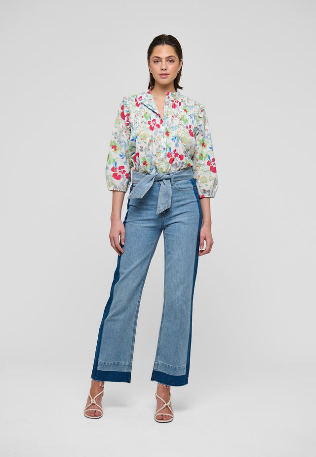 Afslappet og behagelig, men meget feminin, er denne smukke bluse i en farvestrålende bomuldsvoile med blomsterprint perfekt til forår og sommer. Små læg bringer stoffet ind i en standkrave med to rækker flæser. Flere flæser definerer skulderlinjen, mens volumenærmerne ender i en 3/4-længde for en afslappet stemning.