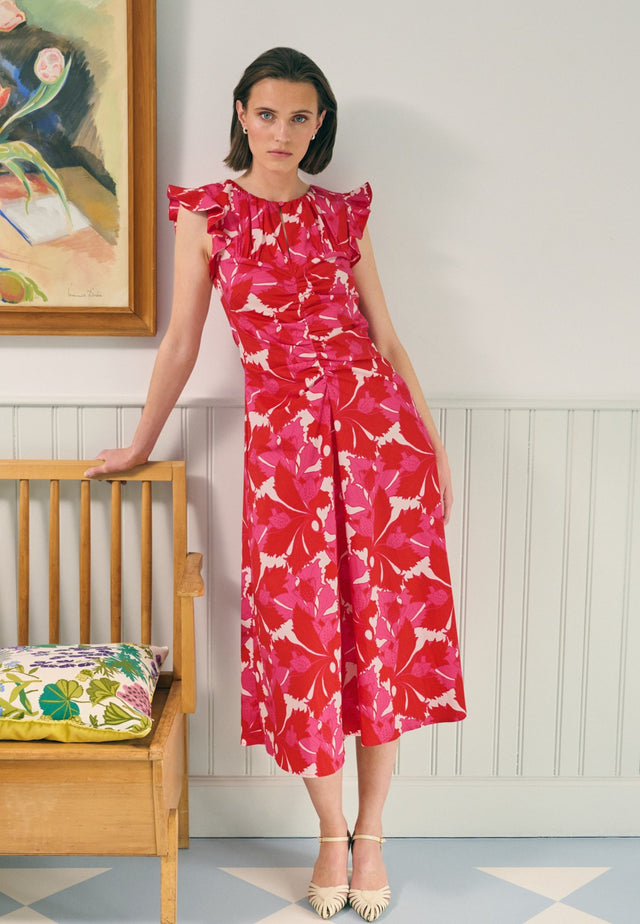Store flæser på skuldrene giver denne smukke bomuldspoplin-kjole en markant silhuet, som glider over i en figursyet overdel med læg ved halsen og et skørt, der falder til midt på læggen. Læg foran skaber yderligere formgivning, og en keyhole-åbning med enkelt knap tilføjer en elegant detalje. Det markante print med røde og pink blade giver kjolen et dramatisk touch.