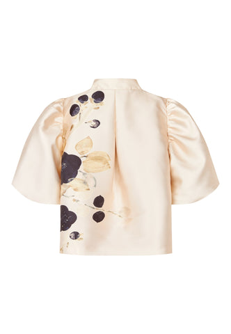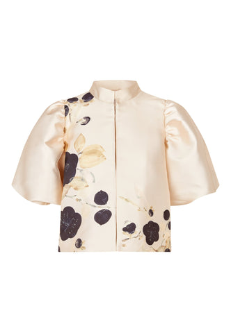 Denne jakke skaber en dramatisk, skulpturel silhuet og er et godt valg til aftenen. Med store ballonærmer og en høj krave lukkes den i nakken med hægte-øje og har skjulte lommer i sidesømmene. Denne elegante version er i cremet taft printet med overdimensionerede lotusblomster.