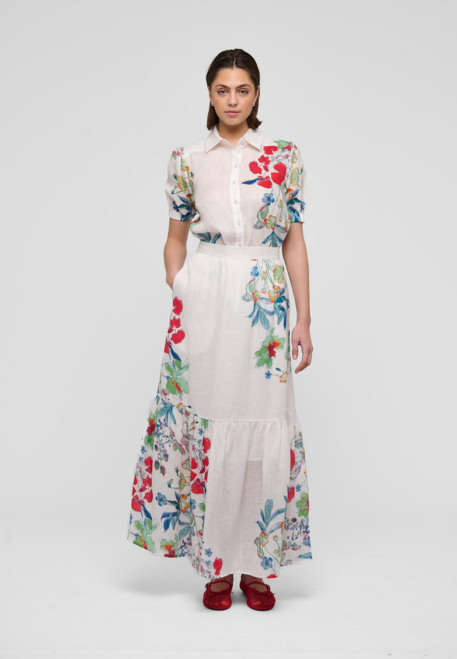 Maleriske blomster falder ned langs denne fuldlange hørnederdel. En dyb flæse tilfører ekstra volumen og en lethed, der gør nederdelen velegnet både til dag og aften.