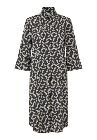 En af Dea Kudibals mest elskede stilarter, denne kjole med let pasform til midt på læggen er afslappet, men stadig sofistikeret. Kimonoudskæringen og kraven skaber et elegant udtryk, mens de dybe ærmer med skjulte knapper giver et let og afslappet look. Denne version er lavet i silke med et fint gingko-bladprint.