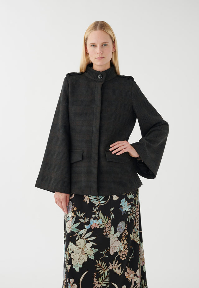 Den høje ståkrave, den skjulte knaplukning og de brede ærmer giver denne chikke jakke et moderne kappe-udtryk. Uventet og stilfuld, dens elegance forstærkes af det mørke ternede stof.