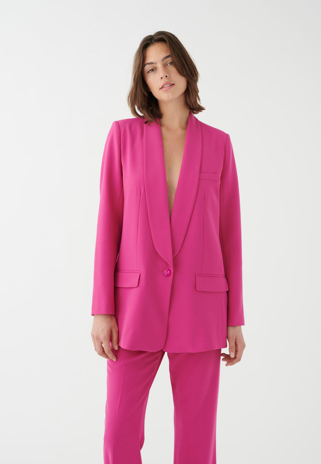 Løst siddende og afslappet, denne baggy blazer med krave og enkelt knaplukning er toppen af afslappet elegance. Den kraftige pink farve gør et meget stilfuldt statement, især når den bæres med de matchende bukser.