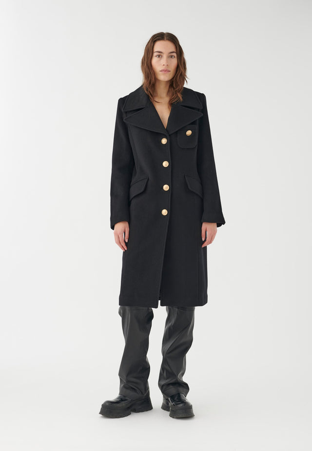 Denne klassiske knælange frakke i sort uld har brede revers og en brystlomme. Messingknapperne giver den et stilfuldt twist.