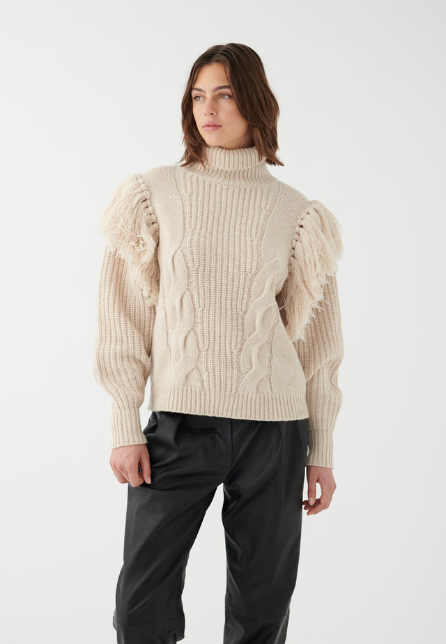 Tilføj lidt drama til dit udvalg af strik med denne smukke cremefarvede højhalsede sweater med frynser, der løber over begge skuldre. Voluminøse ærmer og store kabler på forsiden i et dristigt design.