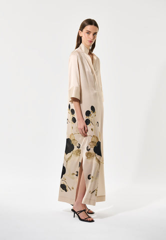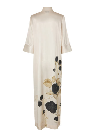 En favoritklassiker fra Dea Kudibal: Helga er en løs, gulvlængde silkekjole med kimono-hals, stående krave og brede 3/4-ærmer. Denne variant præsenterer et iøjnefaldende print med lotusblomster, der synes at blomstre op fra kanten.